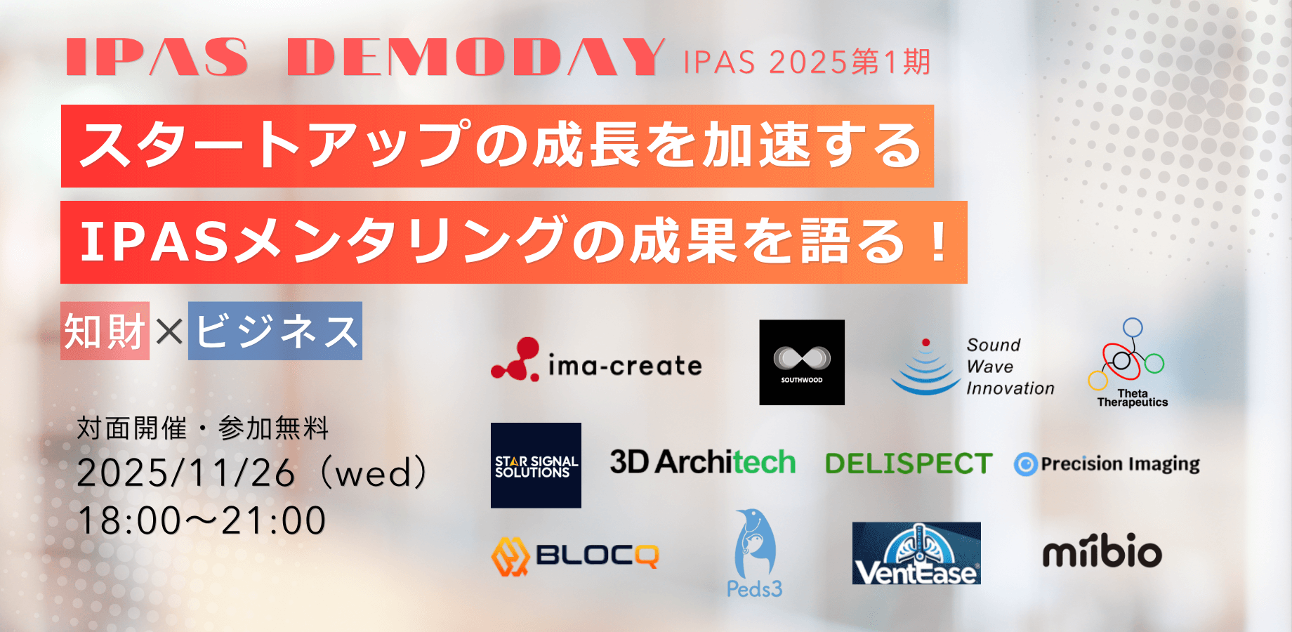 独立行政法人 工業所有権情報・研修館(INPIT)は、スタートアップの成長を事業と知財の両面で加速させる「IPAS(スタートアップに向けた知財アクセラレーション事業)」の成果発表会「Demo Day」を開催します。Demo Dayでは、IPAS2025第1期の支援先スタートアップ12社に、約5か月間のプログラムを通じて得られた成果を発表していただきます。後半では、ビジネス・知財のメンターの方々によるトークセッションを予定しております。